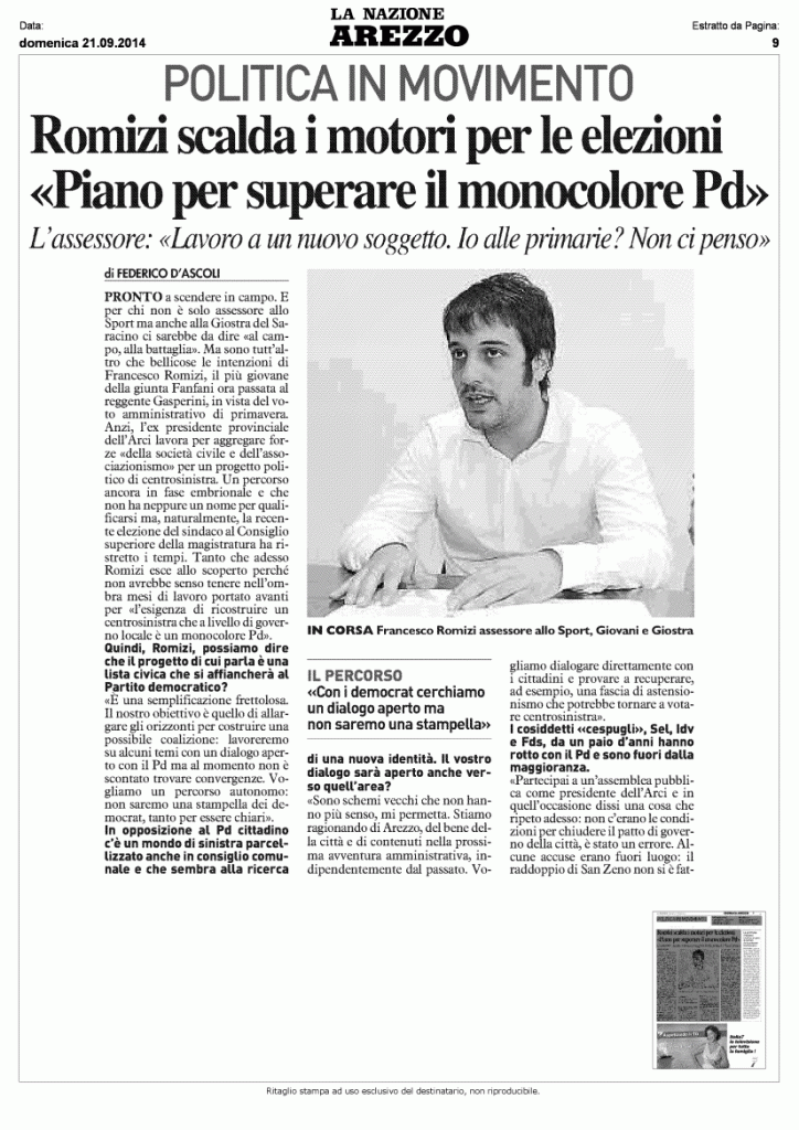 Articolo di Paolo Casalini , tratto da informarezzo.com del 22/09/2014 “Le dimissioni di Fanfani hanno fatto emergere tutte le contraddizioni che in nome di una opposizione dura …Continua a leggere